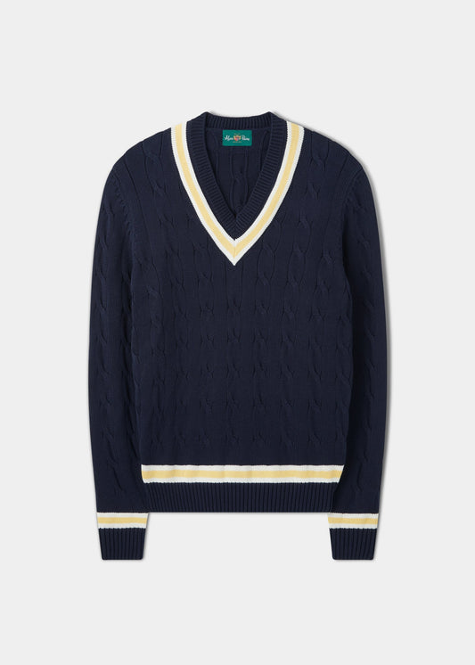 Sandridge Cable Knit Cricket Jumper In Dark Navy & Sun